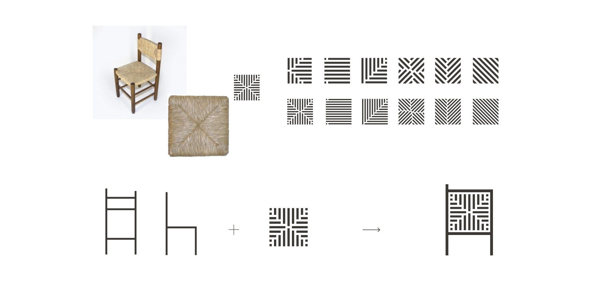 “La silla” como símbolo de hogar, de “ma casa”. Es lo primero que se le ofrece a un invitado cuando llega a una casa donde es bienvenido. De este concepto extraemos otra simbología gráfica que vinculamos con la anterior, y para ello nos inspiramos en la boga (enea), algo tan característico y típico de nuestros hogares.