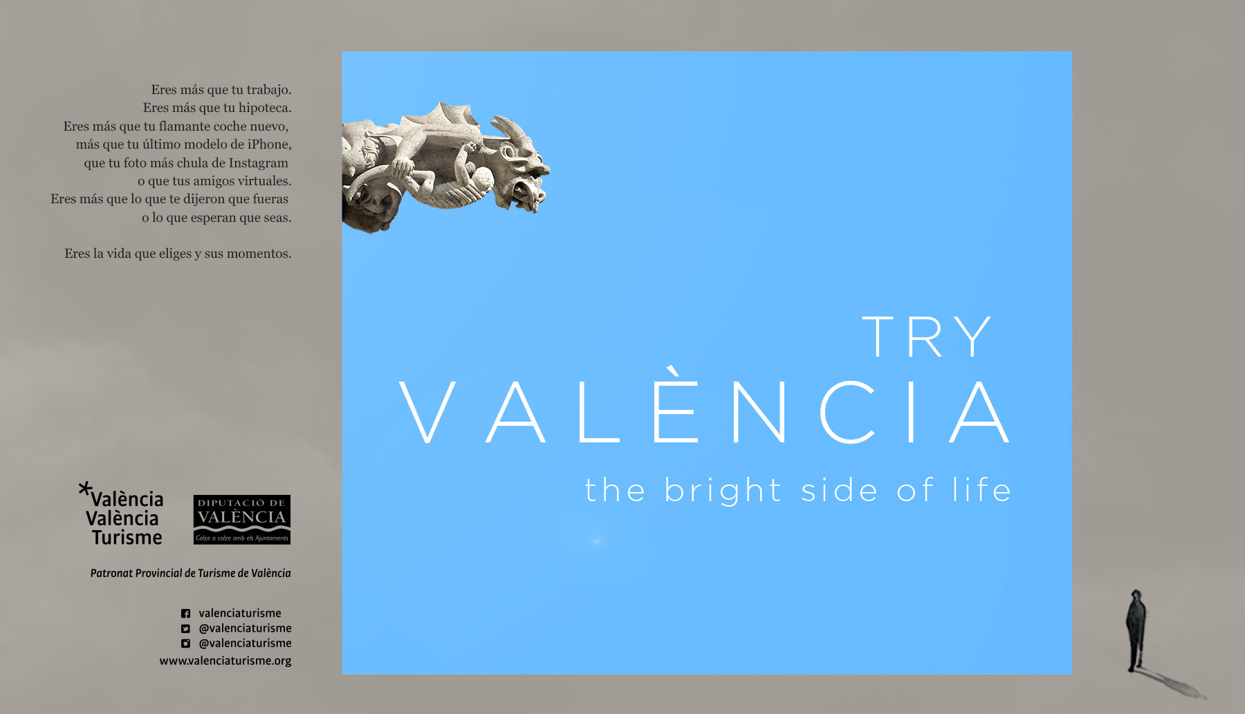 El Patronat Provincial de Turisme de la Diputación de València, nos encarga la campaña gráfica para FITUR, la feria internacional de turismo 2019, con el claim “TRY VALÈNCIA”. Tras un análisis de la realidad del día a día de la mayoría de las personas, pensamos que viajamos para romper con la rutina diaria, una monotonía que en ocasiones hace que nuestras vidas sean anodinas, grises y sin sentido. Utilizamos el viaje como estrategia vital, que nos aparta por unos días de lo absurdo de nuestras vidas.